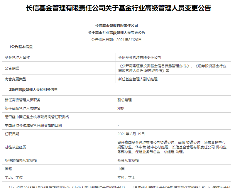 资料显示,长信基金新任副总经理邓挺曾任某基金管理有限公司渠道经理、高级渠道经理、华东营销中心渠道总监、华中营销中心总经理,长信基金管理有限责任公司机构业务部总监、保险业务部总监、总经理助理。