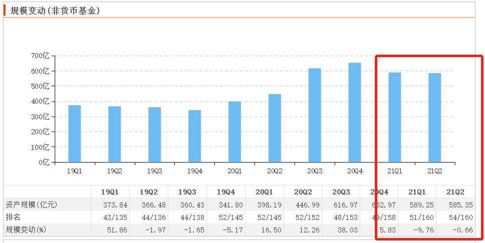 值得一提的是,公司非货币基金规模今年二季度末环比下滑了0.66%,据悉,这已经是该基金公司连续两个季度非货币规模环比下滑了。