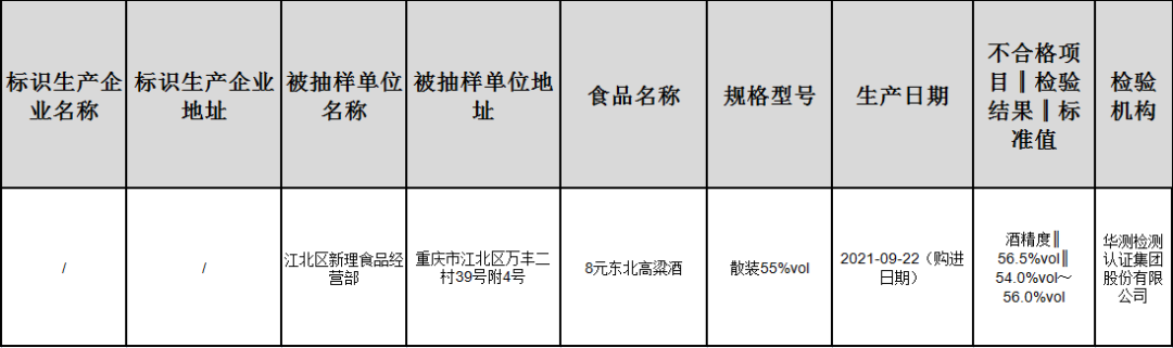 重庆市:1批次8元东北高粱酒酒精度不合格!
