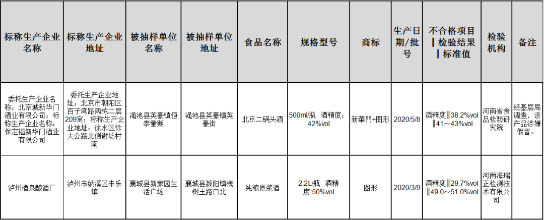 渑池县英豪镇恒泰量贩销售的标称北京城新华门酒业有限公司委托保定福新华门酒业有限公司生产的1批次北京二锅头酒,酒精度检出值为38.2%vol,标准规定为41~43%vol。检验机构为河南省食品检验研究院。经基层局调查,该产品涉嫌假冒。