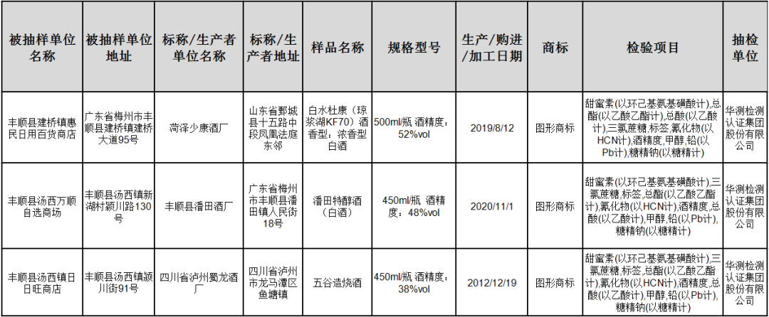 12月28日,广东省丰顺县市场监督管理局公布2021年第7期食品监督抽检信息。本期抽检酒类样品不合格3批次。