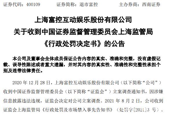 经查明,富控互动(退市富控,600634)存在2019年年度报告存在信息披露义务人报送的报告或者披露的信息有虚假记载、误导性陈述或者重大遗漏等违规行为,因此被给予警告并罚款600万元,对杨影、李欣、朱士民等10个相关责任人员给予警告罚款共计1250万元。值得注意的是,富控互动(退市富控,600634)在不久前因信息披露违法违规已被证监会行政处罚过了,如今已是第二次被罚。