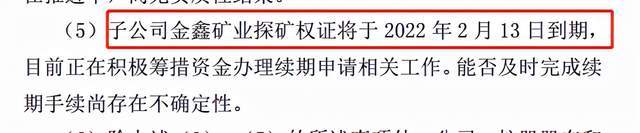 三、金鑫矿业探矿权证将于2022 年2月13日到期,目前正在积极筹措资金办理续期申请相关工作。能否及时完成续期手续尚存在不确定性。