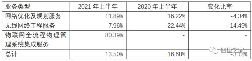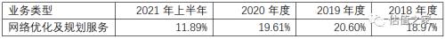 从上表可以看出,占公司收入比重在90%以上的网络优化及规划服务业务,在报告期,除2019年同比2018年略微增长1.63个百分点外,其他各期均同比下滑,其中2020年相比2019年下降0.99个百分点,2021年上半年相比2020年全年下降7.72个百分点,扣除季节性影响后,同比2020年上半年仍然下降4.34个百分点。