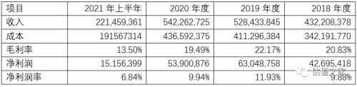 公司2021年上半年收入为2.21亿元,折合全年为4.42亿元,相比2020年收入5.42亿元下降18.32%,2020年收入相比2019年略微增长,增长率为2.62%,2019年收入相比2018年增幅为22.26%。从这个趋势上我们可以看出,收入增幅逐年下滑,到最近一期为负增长。