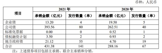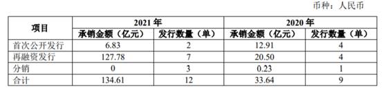 其中,国联证券通过全资子公司华英证券从事投资银行业务。2021年华英证券完成股权承销保荐项目9单,其中IPO项目2单,再融资项目7单,另有IPO分销项目2单,再融资分销项目1单,合计承销金额人民币134.61亿元,同比增长300.15%。目前已有取得批文待发行项目2单,在审项目3单,申报辅导项目13单。
