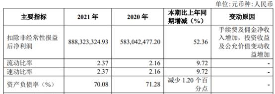 截至2021年末,国联证券流动比率为2.37,同比增长9.72%;速动比率为2.37,同比增长9.72%;资产负债率为70.08%,同比减少1.20个百分点。