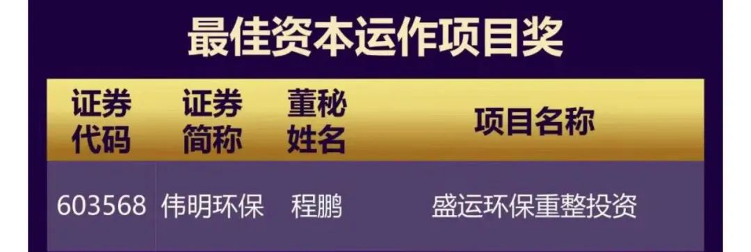 2021年,公司作为重整投资人,完成了盛运环保重整投资项目。该项目有助于提升公司运营管理及并购整合能力,也成为上市公司间破产重整、资本助力整合的成功案例,得到监管机构、投资者的广泛认可。在此次评选中,该案例从数十个入围的资本运作项目中脱颖而出,成为十大最佳资本运作项目奖之一。