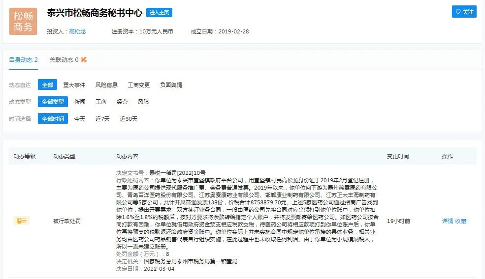 ●该单位用宣堡镇村民高松龙身份证于2019年2月登记注册,主要为医药公司提供现代服务推广费、会务费普通发票。2019年以来,该单位向下游为泰州瀚霖医药有限公司、青岛百洋医药股份有限公司、江苏奥赛康药业有限公司、邯郸康业制药有限公司、江苏正大丰海制药有限公司等5家公司,共计开具普通发票138份,价税合计8758879.70元。