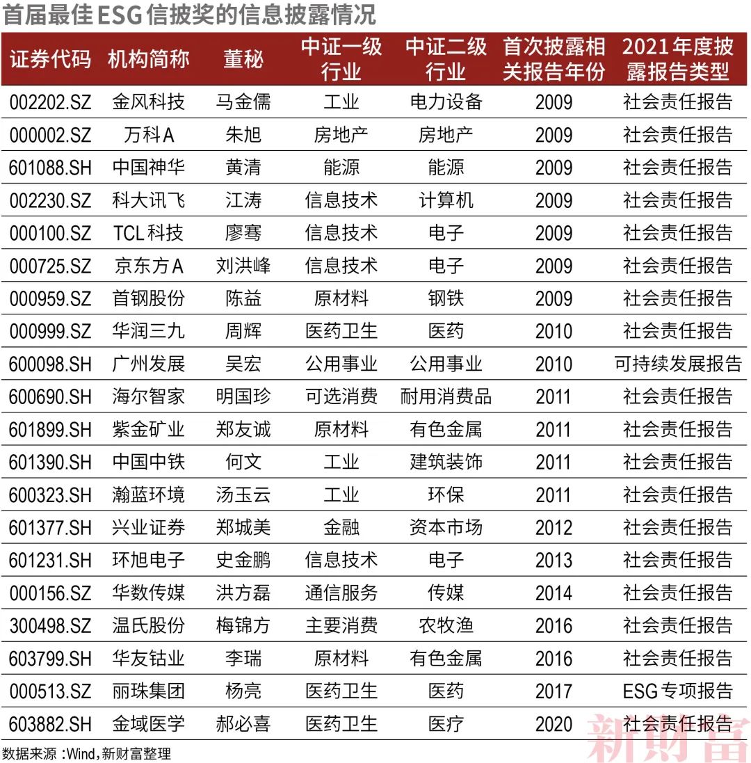 2022年,为服务国家战略,助力资本市场主体可持续发展,新财富首次将ESG纳入第十八届新财富金牌董秘评选,设立“最佳ESG信披奖”。这一奖项评选中,新财富秉承一贯的公平、公正、公开原则,以公开数据为基础,依托自身丰富的资本市场资源,结合上市公司自主报名提交的资料、中证指数有限公司ESG评价体系,最终得出这一单项奖获奖名单。