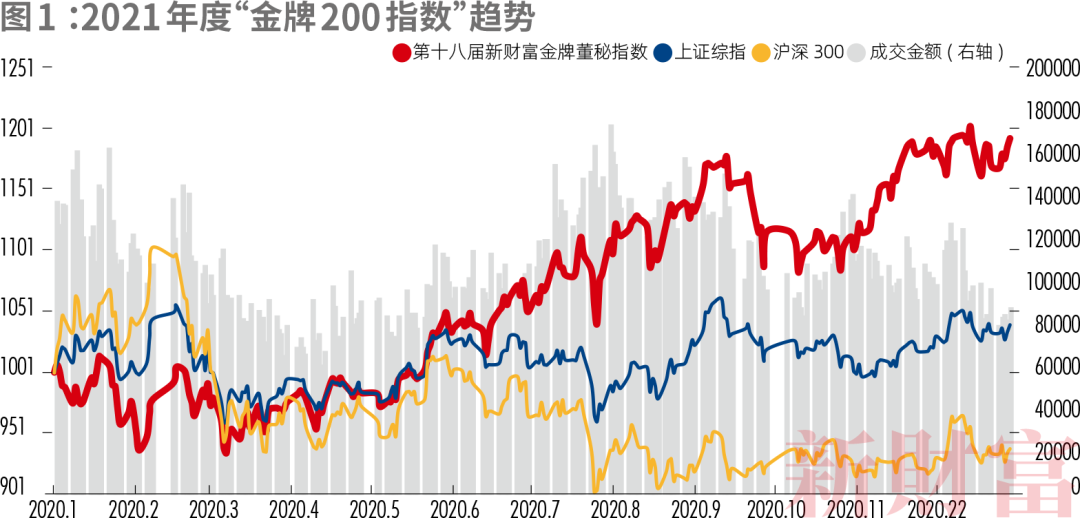 以本届200家“金牌”公司作为成分股,以2021年1月4日为基期,编制“2021年度金牌200指数”(图1)。结果显示,“金牌200指数”在2021年一季度整体走势低于大盘,经历二季度调整后,于三季度开始拉升,期间伴随行情震荡起伏,最终以先抑后扬之势逐渐跑赢大盘。