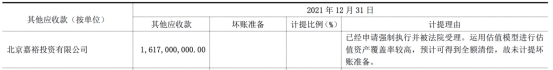 年报显示,截止2021年末,华创阳安有16.17亿元应收款来自北京嘉裕投资有限公司(简称“北京嘉裕”),该款项为受让太平洋证券股权终止交易后,北京嘉裕应返还华创阳安的保证金及相应利息。华创阳安表示,因已经申请强制执行并被法院受理。运用估值模型进行估值资产覆盖率较高,预计可得到全额清偿,故未计提坏账准备。