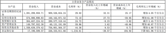 主营业务分产品来看,证券及期货经纪业务营收12.81亿元,同比增长32.31%,毛利率29.02%,比上年增加4.05个百分点;信用交易业务营收5.74亿元,同比增长27.72%,毛利率72.10%,比上年增加61.08个百分点;投资银行业务营收3.85亿元,同比减少8.23%,毛利率24.72%,比上年减少3.45个百分点;资产管理业务营收1.50亿元,同比增长3.62%,毛利率59.86%,比上年增加40.87个百分点;投资及其他业务营收13.59亿元,同比增长9.53%,毛利率44.36%,比上年增加4.88个百分点;非证券行业营收1719.06万元,同比减少38.57%,毛利率-1216.61%,比上年下降921.96个百分点。