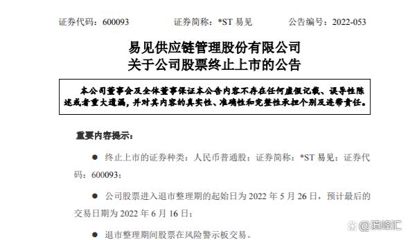 近日,A股市场开启批量退市模式。继*ST罗顿(维权)、*ST中天(维权)等6家公司公告终止股票上市后,5月18日晚间,云南上市公司*ST易见(维权)也发布了被终止上市的公告,公司将于5月26日进入退市整理期,预计最后的交易日期为6月16日。
