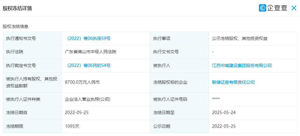 5月26日,江苏中南建设集团股份有限公司(以下简称:中南建设)所持联储证券有限责任公司(以下简称:联储证券)8700万元股权遭冻结,执行通知书文号为(2022)粤06执保59号,执行法院为广东省佛山市中级人民法院,冻结期限从2022年5月25日到2025年5月24日。
