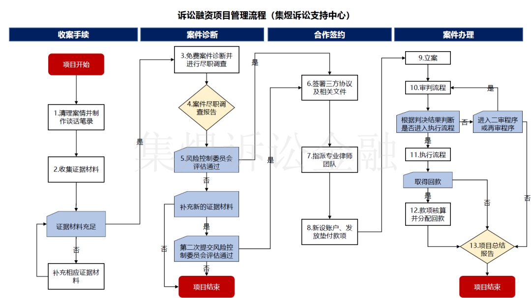 集煜诉讼金融基金提供资金支持,诉讼费、保全费、律师费、差旅费等所有费用由基金承担。案件胜诉并执行到位后,委托人根据实际受偿款项按比例支付服务费用。