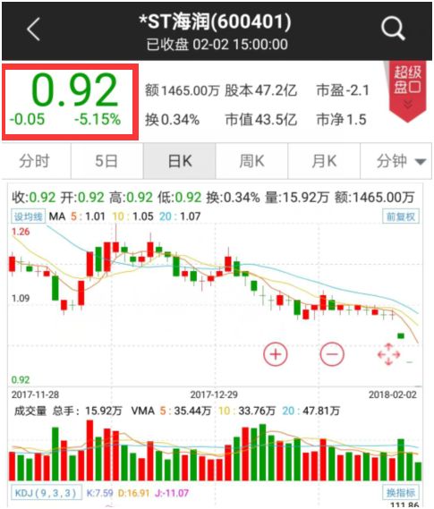 昨天已开始成为“仙股”的*ST海润(600401.SH)今日继续跌停,它至少还得在“仙股”的位置上待上几天。
