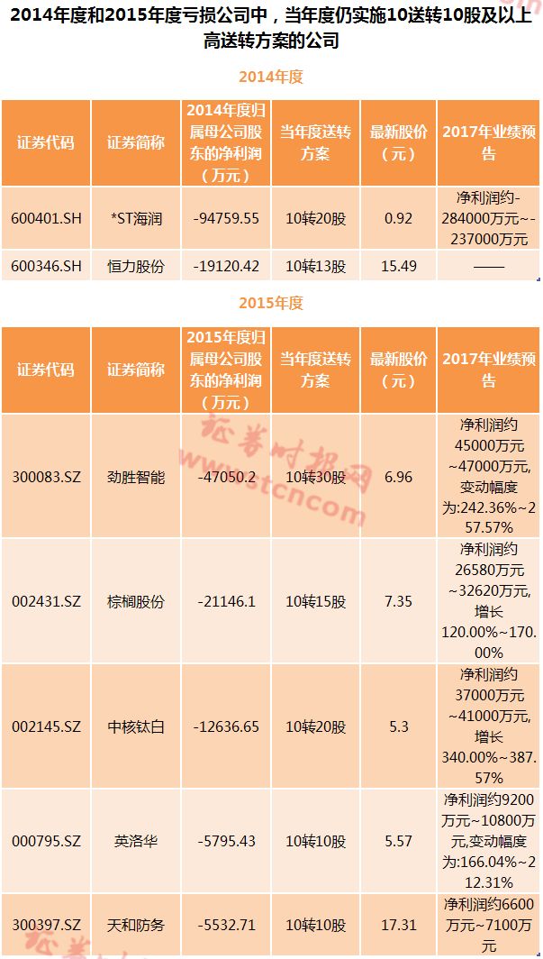 除了*ST海润外,在2014年度和2015年度出现亏损的公司中,也有部分公司实施了高送转,如2014年度恒力股份亏损1.91亿元,当年度公司实施了10转13股的送转方案。