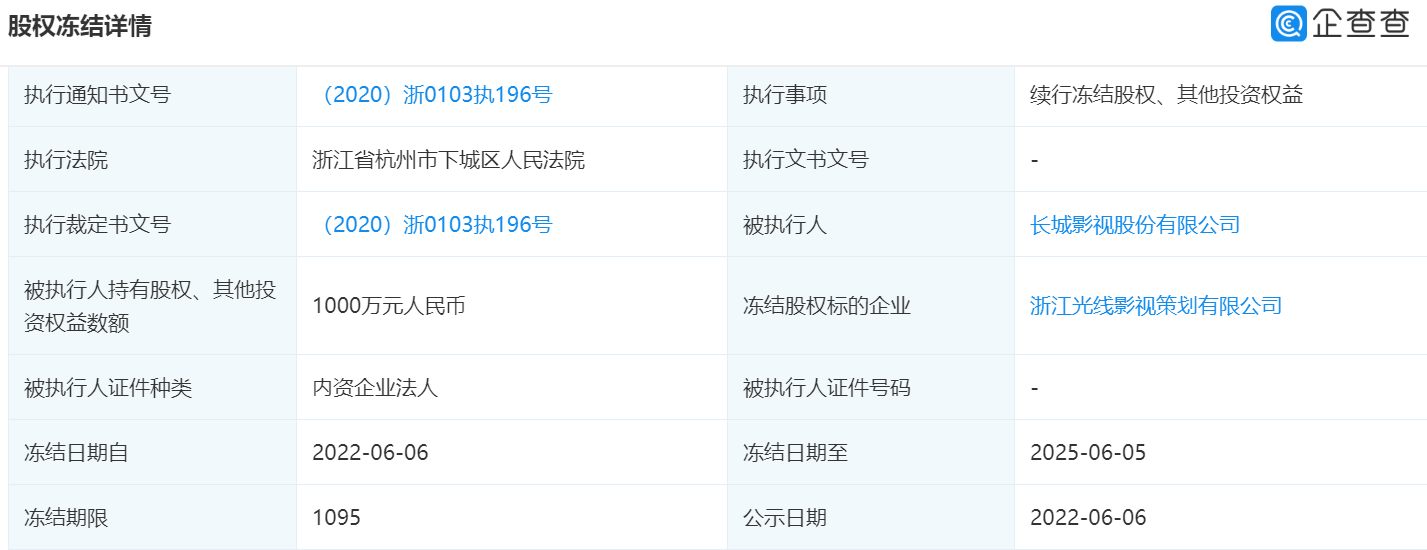 6月6日,长城影视股份有限公司(以下简称“长城影视”)新增股权冻结,执行通知书文号为(2020)浙0103执196号,被执行人为长城影视,冻结股权标的企业为浙江光线影视策划有限公司,冻结权益数额为1000万元,冻结期限从2022-06-06到2025-06-05。