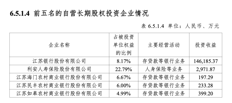 与信托主业相“映衬”的是江苏信托的“副业”金融股权投资。在年报中,江苏信托提到起经营目标包括推进信托业务转型,做好江苏银行、利安人寿等金融股权投资管理。