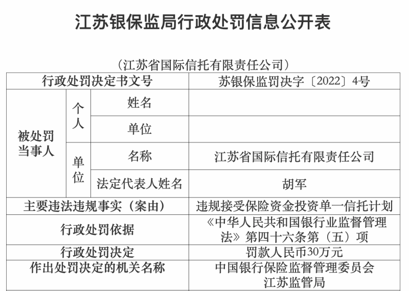 日前,江苏省国际信托有限责任公司(下称“江苏信托”)及一名管理人员收到江苏银保监局下发的两张罚单。内容显示,江苏信托因违规接受保险资金投资单一信托计划,被罚没30万元,管理人员李起年因对该项违法违规事实负领导责任,遭到警告并罚款6万元。