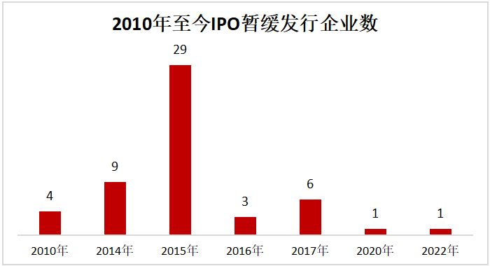 前者主要是因2015年股市大跌,即2015年6月15日,上证指数从5170点高位突然掉头向下,不到一个月时间,重挫近1500点,短期急跌带来了整个市场的恐慌情绪蔓延。同年7月4日,28家新股集中发布暂缓发行公告,称因市场波动较大,决定暂缓后续发行工作,部分已经启动申购程序的新股将退回申购资金。