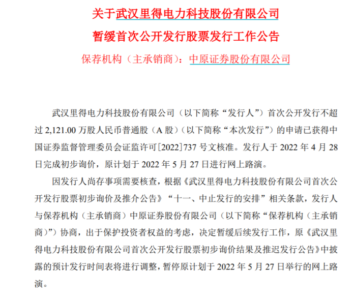 5月26日,主板申报企业里得电科发布公告宣布暂缓首次公开发行股票发行,这也是自2020年以来,首家暂缓发行企业。