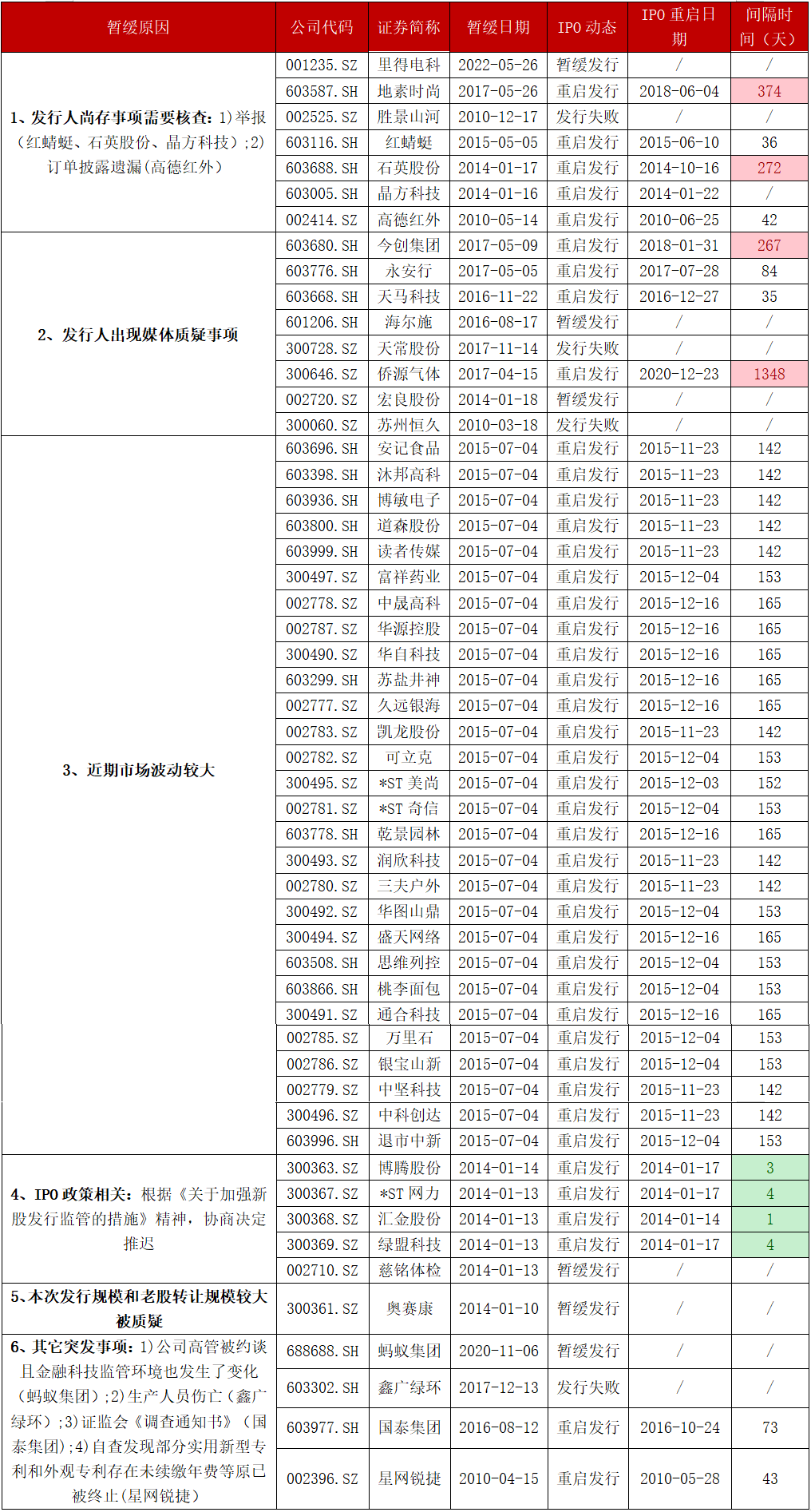 其中,第3项“发行期间市场波动较大暂缓发行”与第4项“受相关IPO新颁布政策影响”存一定的偶发性,且这类原因被暂缓企业基本都会重启。