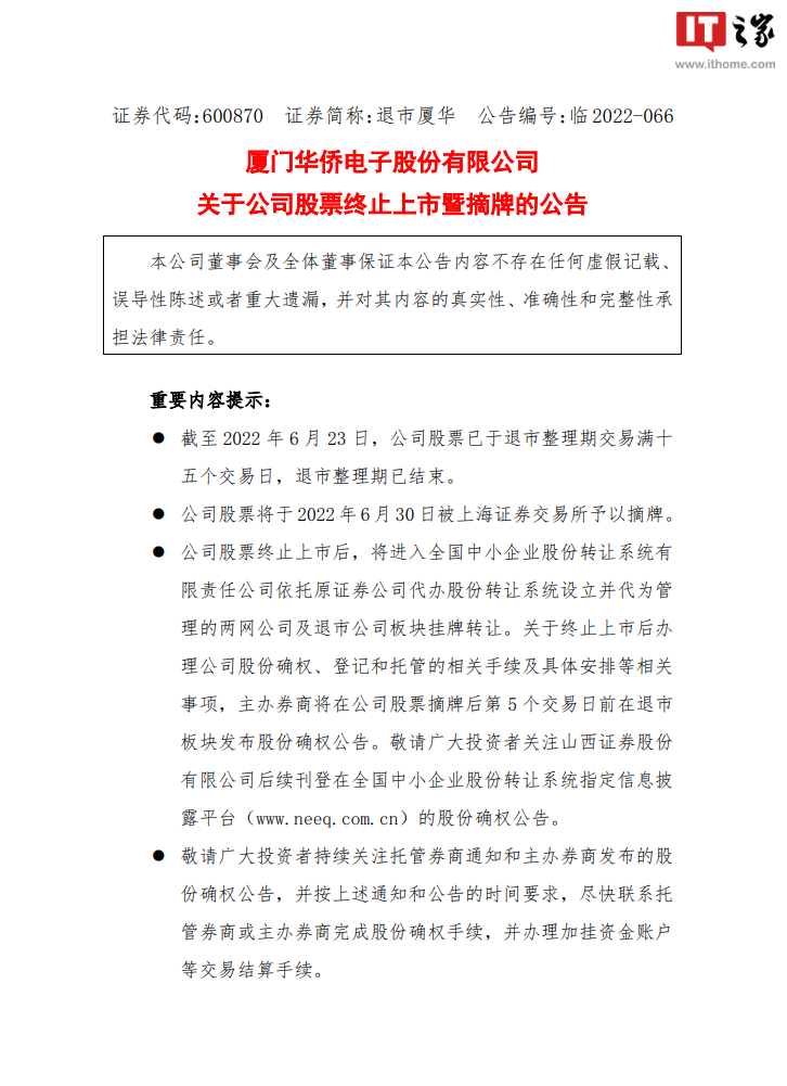 IT之家 6 月 24 日消息,厦门华侨电子股份有限公司 6 月 23 日晚发布《关于公司股票终止上市暨摘牌的公告》,公司股票将于 6 月 30 日被上交所予以摘牌,公司股票终止上市。