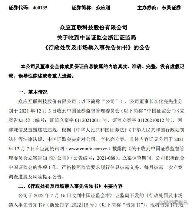 2022年7月21日,众应互联(002464)公告收到中国证监会浙江证监局下发的《行政处罚及市场禁入事先告知书》(浙处罚字[2022]16号)。证监会对公司及时任实际控制人李化亮涉嫌信披违法一案调查完毕,并拟作处罚。众应互联未及时披露及未在2020年年报、2021年半年报中披露为关联方提供担保情况,违反《证券法》相关规定,构成违法行为。因此,证监会拟对众应互联处以100万元罚款,李化亮处以300万元罚款并采取3年证券市场禁入措施。