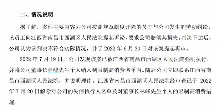 7月25日,正邦科技针对此事发布公告称,此次涉及案件为劳工纠纷。在7月19日发现董事长被限消后,公司已与法院联系并说明理由。7月20日,法院经审查已解除了对正邦科技失信执行人名单及对董事长林峰的限制高消费措施。