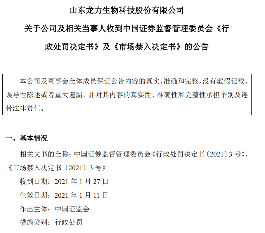 因龙力生物虚增银行存款及虚减对外借款及相关费用、未披露对外担保、未及时披露重大诉讼和仲裁、擅自改变首次公开发行股票所募集资金的用途等虚假陈述行为,证监会于2021年1月13日对龙力生物及程少博等18名责任主体作出《行政处罚决定书》,对各主体的违法行为作出相应处罚。