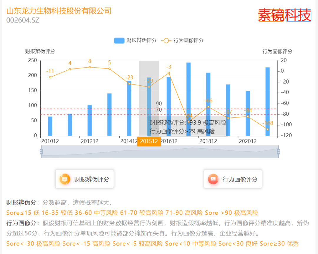 从下图可见,龙力生物近十年财报造假“极高风险”预警。