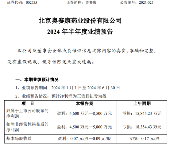 挖贝网7月12日,奥赛康 近日发布2024年半年度业绩预告,报告期内归属于上市公司股东的净利润6,600万元—8,500万元,较上年同期扭亏为盈;基本每股收益0.07元/股—0.09元/股。