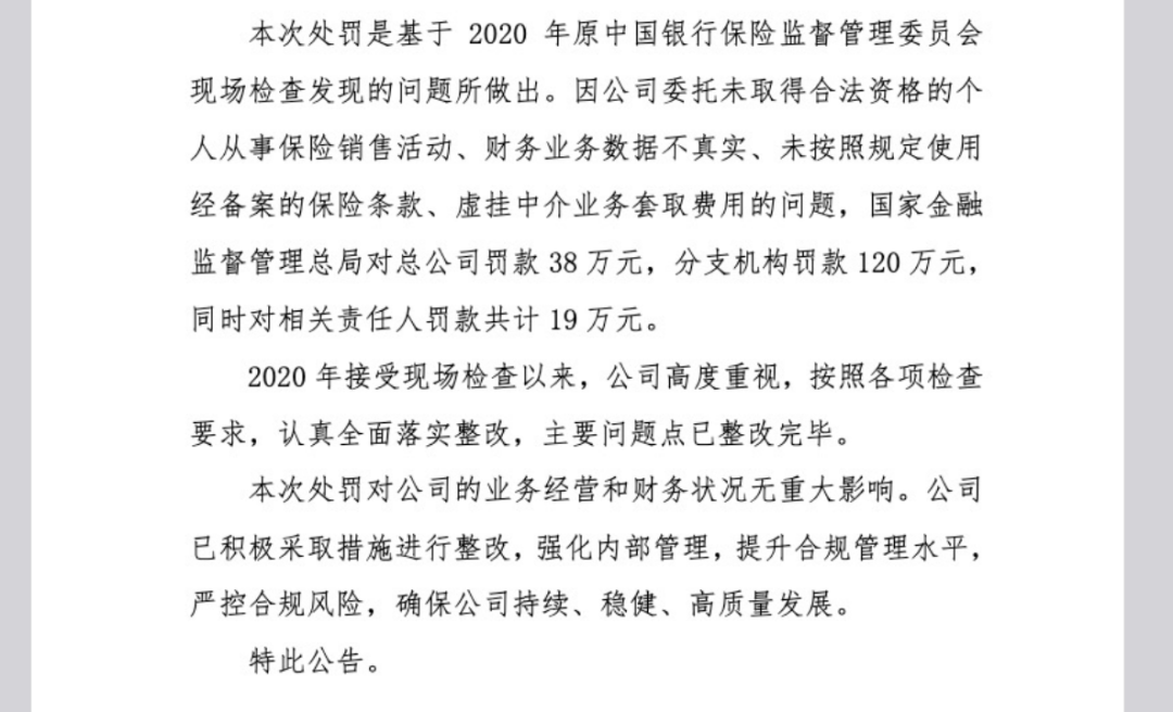 复星联合健康保险方面表示,该次处罚是基于2020年原保监会现场检查发现的问题所做出,且此次处罚对公司的业务经营和财务状况无重大影响,公司已积极采取措施进行整改。