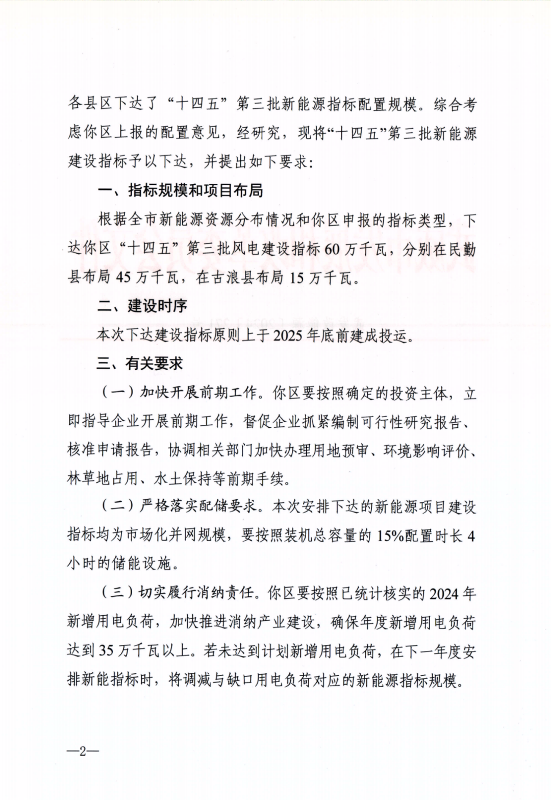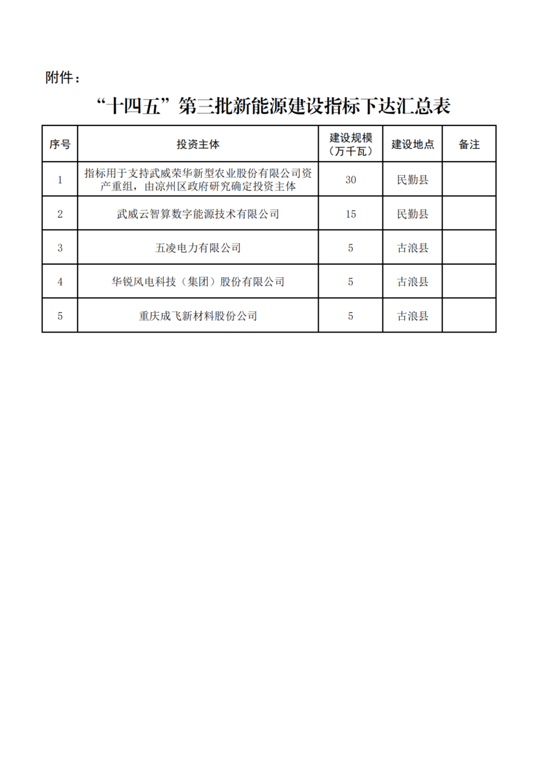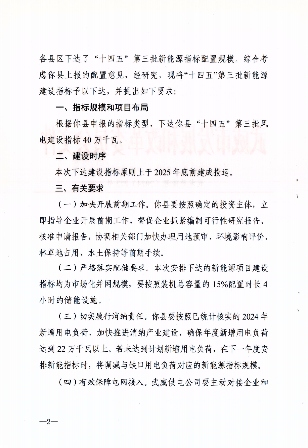 7月30日,甘肃省武威市发改委发布《关于下达“十四五”第三批新能源建设指标的通知》。《通知》显示,武威市本次共下达100万千瓦风电建设指标,其中,古浪县布局55万千瓦,民勤县布局45万千瓦。以上建设指标原则上均于2025年底前建成投运。