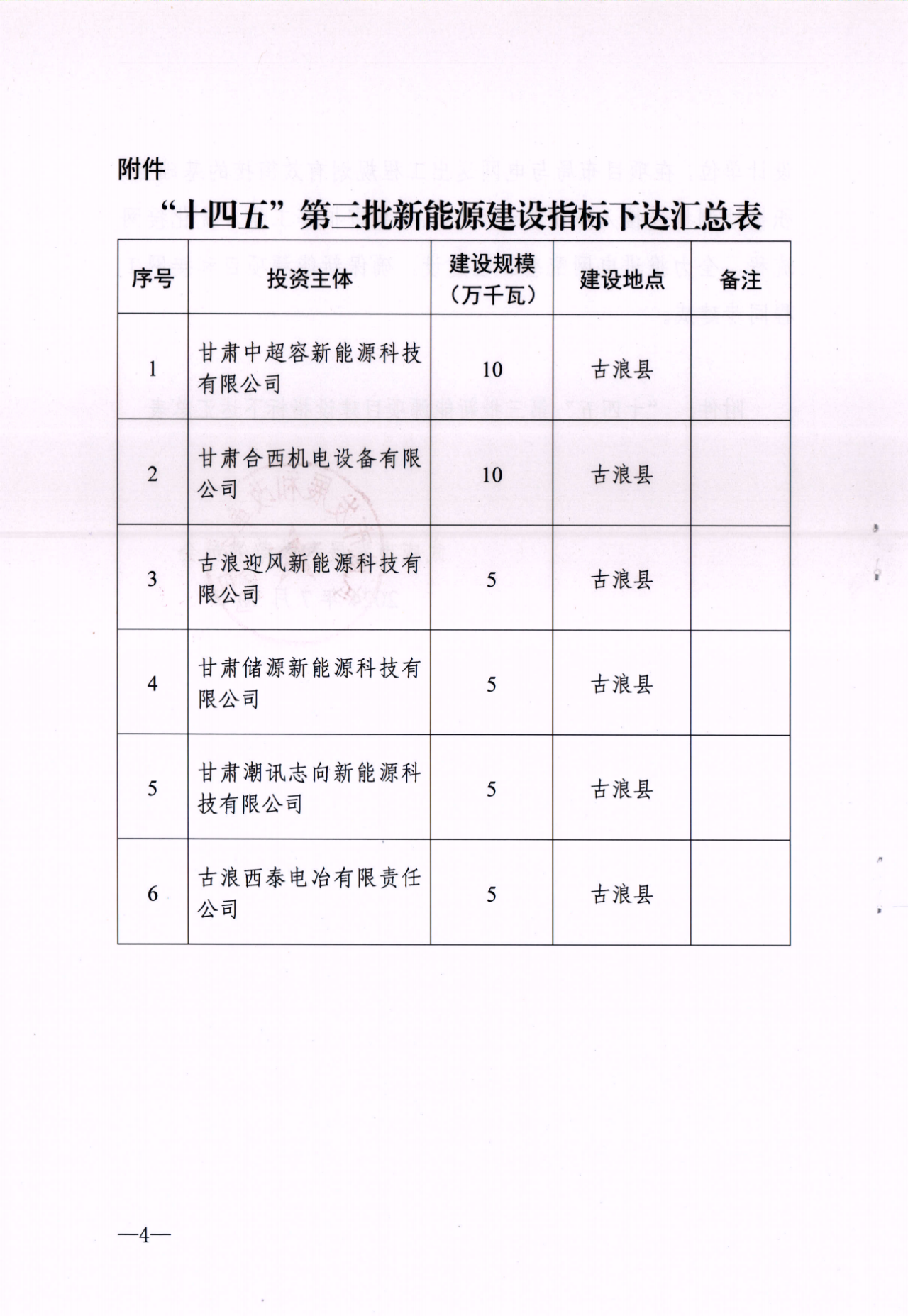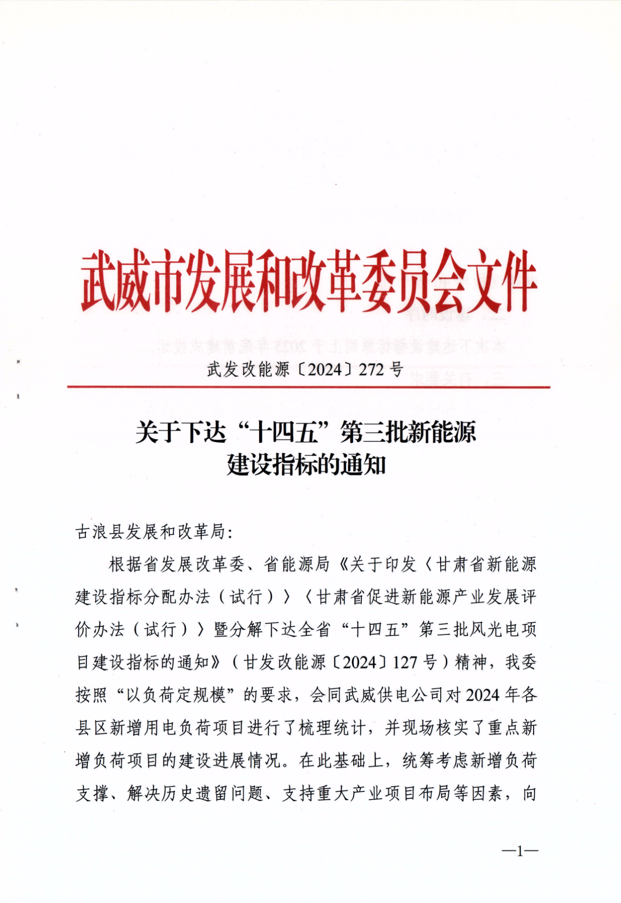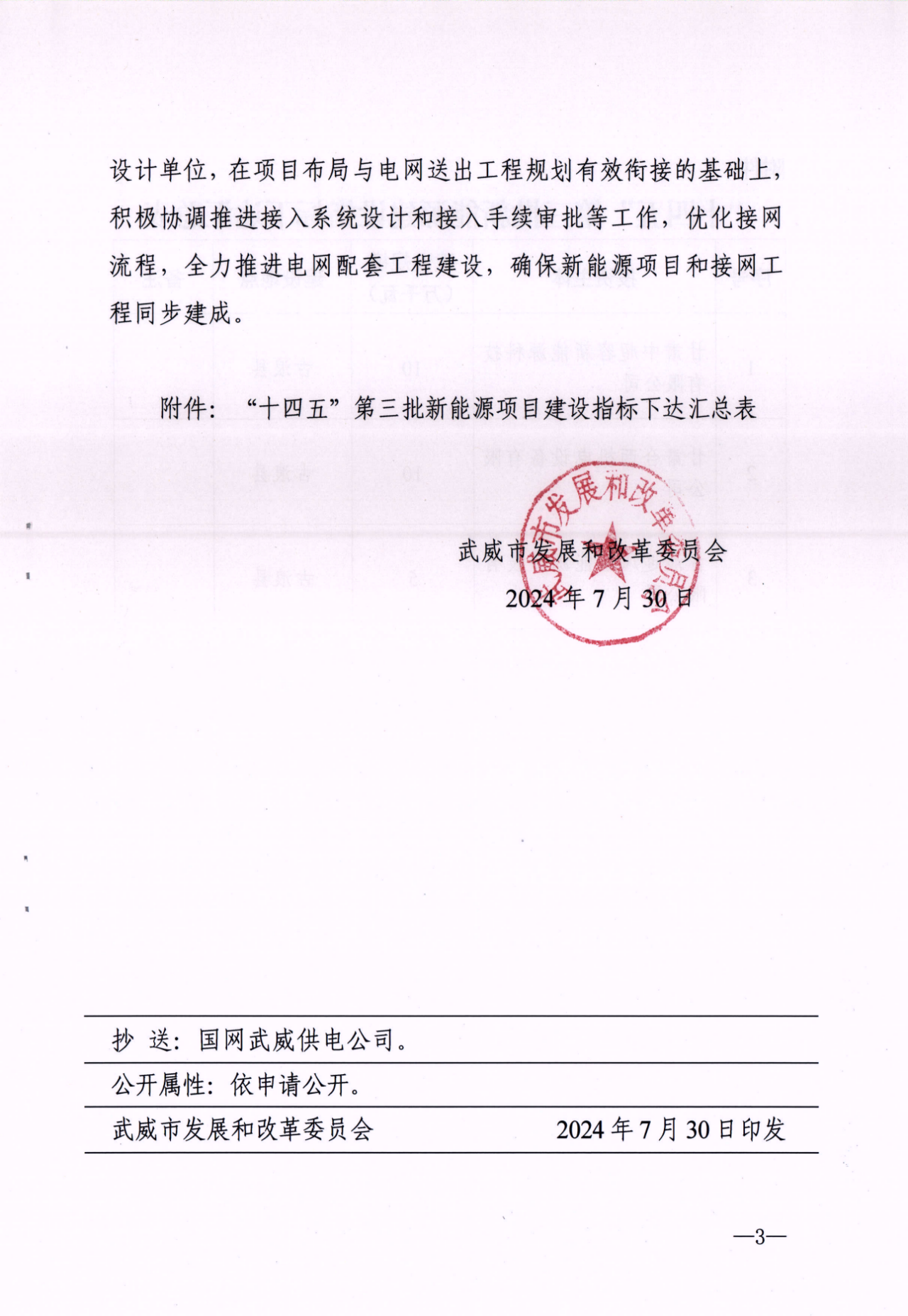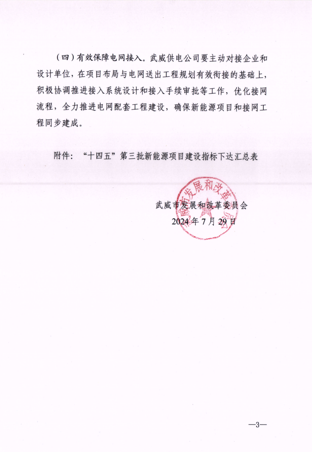 7月30日,甘肃省武威市发改委发布《关于下达“十四五”第三批新能源建设指标的通知》。《通知》显示,武威市本次共下达100万千瓦风电建设指标,其中,古浪县布局55万千瓦,民勤县布局45万千瓦。以上建设指标原则上均于2025年底前建成投运。