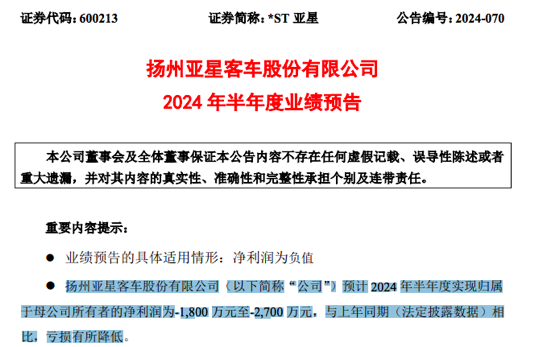 *ST亚星1999年8月在上交所主板上市,注册地江苏省扬州市,主营客车生产制造。截至2024年一季度末,公司资产总额29.88亿元,净资产-1.09亿元;2023年全年营收12.10亿元,净利润-3.37亿元。根据2024年半年报业绩预告,公司业绩有所好转,但仍处于亏损状态,归母净利润预亏1800万元至2700万元。