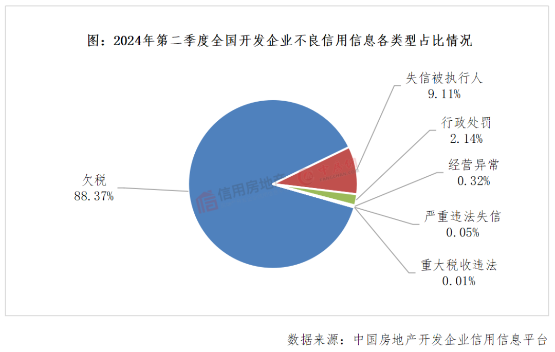 报告显示,根据中国房地产业协会房地产开发企业信用信息平台(以下简称“房地产信用平台”)收录统计,第二季度全国房地产开发企业各类不良信用信息共计93088条,同比增加52.07%,环比2024年一季度增加16.35%。从开发企业产生的不良信用信息类型来看,主要为欠税信息,占比约为88.37%,其次为失信被执行人和行政处罚信息。需要说明的是,欠税信息的上升,与相关部门的披露时间、查处及追溯力度有一定关系。