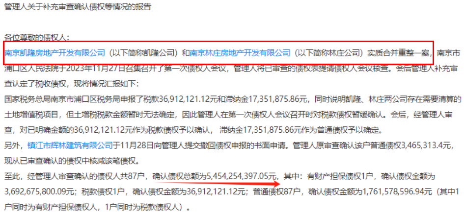 2024年7月15日,南京市浦口区人民法院发布公告,宣告南京凯隆房地产开发有限公司、南京林庄房地产开发有限公司破产,经管理人审查确认的债权人共87户,确认债权总额约为54.54亿。