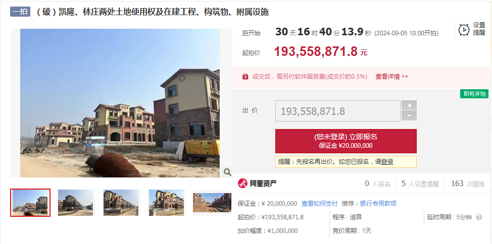 近日,阿里法拍上架了“(破)凯隆、林庄两处土地使用权及在建工程、构筑物、附属设施”项目。
