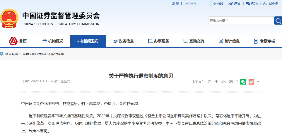 2024年4月21日,中国证监会发布《关于严格执行退市制度的意见》,强调要“进一步严格强制退市标准”,体现出监管力度加大的趋势,也意味着未来已上市的环保企业将面临更严格的监管标准。