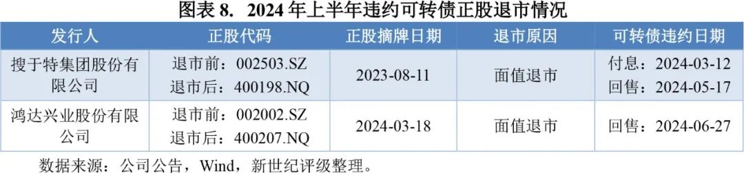 2024年上半年可转债首次发生违约,涉及可选消费、化工等行业。2024年以来监管机构持续加强对上市公司“退市常态化”的制度建设和监管力度,资本市场尾部企业出清加快,部分企业退市的可转债面临强制回售,构成实质性违约。预计2024年下半年可转债市场仍处于风险暴露阶段。