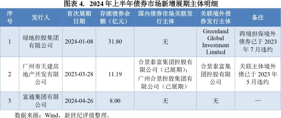 在2024年上半年3家新增展期主体中,除富通集团为首次发生债券偿付信用风险事件之外,绿地控股、广州天建此前均已有关联方发生境外债券违约。具体来看,2023年7月,绿地控股通过跨境担保方式发行的美元债券违约,随后公司于2023年10月对存续美元债达成展期;广州天建为港股上市公司合景泰富集团(股票代码:1813.HK)的境内子公司,合景泰富集团自2023年5月以来共有9支美元债券违约,涉及到的债券金额共39.56亿美元,同时合景泰富集团的另一家境内子公司广州合景控股也已经发生债券展期。
