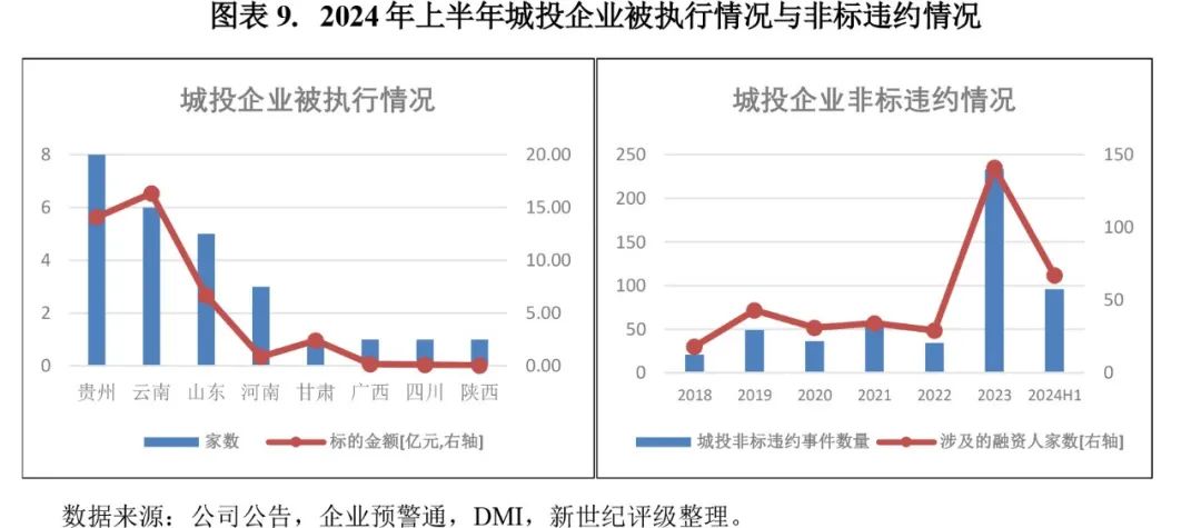 2024年上半年城投企业总体信用状况呈现稳步改善态势,信用风险事件主要集中于往年已发生风险暴露的地区。上半年城投企业风险事件主要包括列入被执行人名单、非标违约、商票逾期等。具体来看,上半年共有26家城投企业发行人披露被执行情况,涉及到的被执行标的金额共40.64亿元;67家发生非标违约。从区域分布来看,上半年发生信用风险事件的城投企业集中于贵州省和云南省、山东省、河南省的部分地区,并未呈现扩散态势。