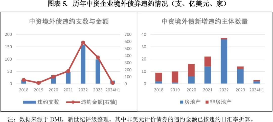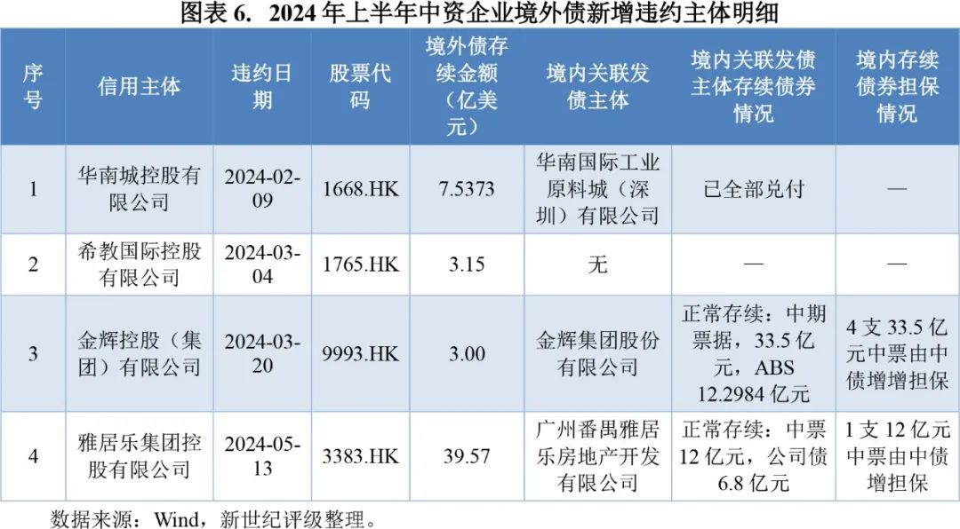 2024年上半年中资境外债新增违约主体数量也明显减少,并且其关联主体在境内债券市场存续债券大多也具有外部增信。2024年上半年中资境外债新增违约主体4家,较上年同期减少10家,其中房地产企业3家,分别为华南城、金辉控股和雅居乐集团。从境内关联发债情况来看,上述新增违约房企存续的境内关联债券以中期票据为主,大多具备外部增信措施。具体来看,华南城境内子公司发行债券已全部到期兑付,金辉控股和雅居乐集团境内子公司存续债券共69.60亿元(含1期资产支持证券12.30亿元),其中5支共45.50亿元中期票据由中债增提供担保。