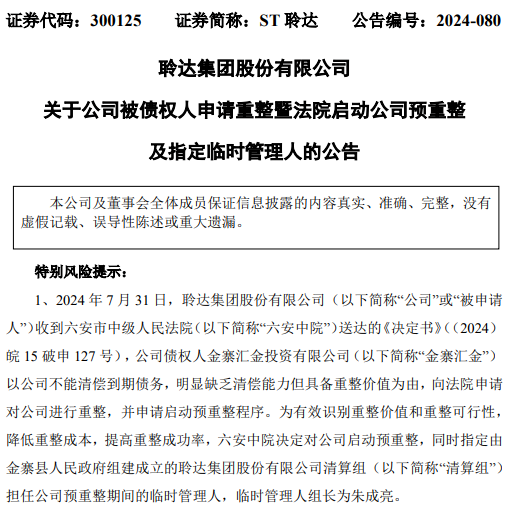 7月31日,ST聆达公告,该公司收到六安市中级人民法院送达的《决定书》。该公司债权人金寨汇金投资有限公司以公司不能清偿到期债务,明显缺乏清偿能力但具备重整价值为由,向法院申请对公司进行重整,并申请启动预重整程序。