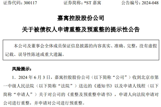 7月18日,ST嘉寓公开披露《关于法院指定公司预重整期间临时管理人的公告》;6月3日,ST嘉寓发布公告称,申请人钱程向北京市第一中级人民法院申请对公司进行重整,并申请启动预重整程序。公告显示,截至公告披露日,ST嘉寓尚欠申请人2,978,542.57元(297.85万元)债务。6月7日,北京市第一中级人民法院决定对ST嘉寓启动预重整。