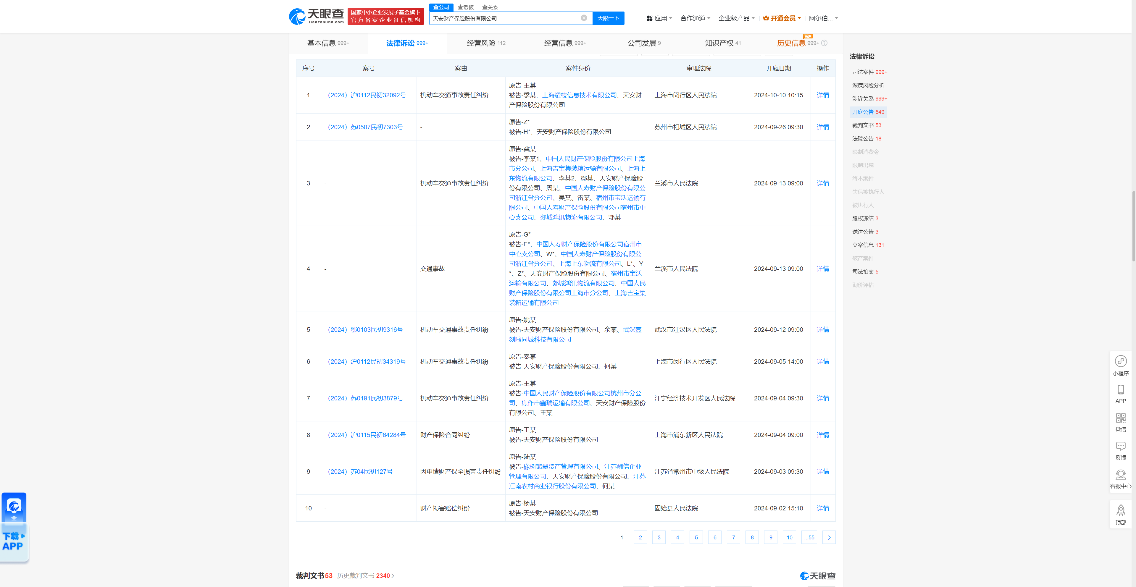 2024年1月以来,天安财险被告多次,案件遍及江苏、上海、湖北、广东、重庆等地。从案件案由来看,主要以机动车交通事故责任纠纷、财产保险合同纠纷、因申请财产保全损害责任纠纷等为主。