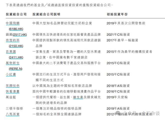 截至目前,公司投出了包括飞鹤、周黑鸭、百果园、小红书、奈雪的茶、钟薛高、笑果文化、快看漫画、江小白、美味不用等、德州扒鸡、饭扫光、凤凰医疗、慈铭体检等众多知名品牌。